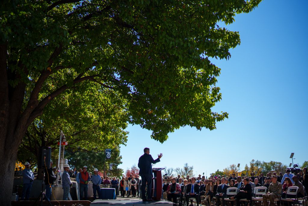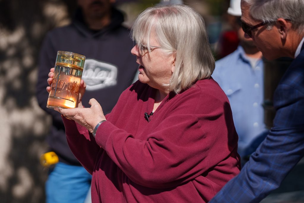 Z ARRAY — Labs historian Rebecca Ullrich lifts a Z array from the 50th anniversary time capsule. Z arrays were previously used in Z machine testing. (Photo by Craig Fritz)MAYORAL REMARKS — Albuquerque mayor Tim Keller proclaims that Sandia will be recognized for its 75th anniversary on Nov. 1. (Photo by Craig Fritz)