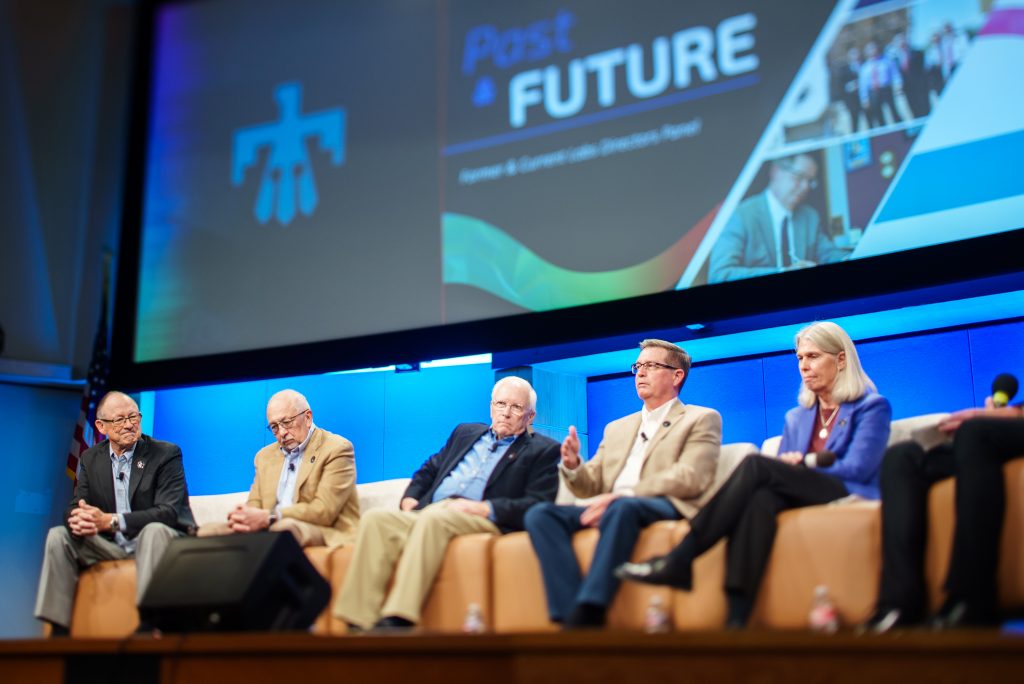 LABS DIRECTOR ROUND UP — From left, Thomas Hunter, Paul Hommert, Steve Younger, James Peery and Jill Hruby participate in a panel discussion of the current and former Sandia Labs Directors in Steve Schiff Auditorium on Oct. 30. (Photo by Craig Fritz)