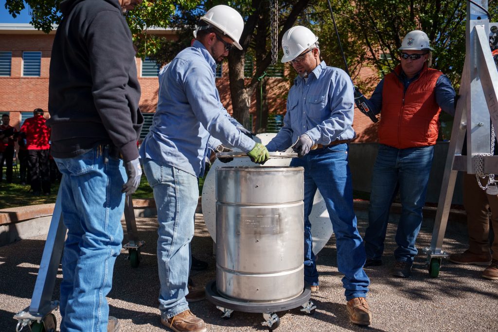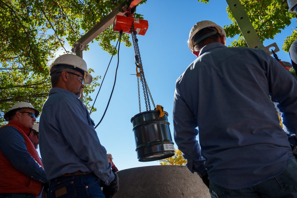 LOWERING THE CAPSULE — A new time capsule is lowered at Sandia’s 75th anniversary event on Oct. 31. The capsule replaces one that was placed during Sandia’s 50th anniversary celebration. (Photo by Craig Fritz)