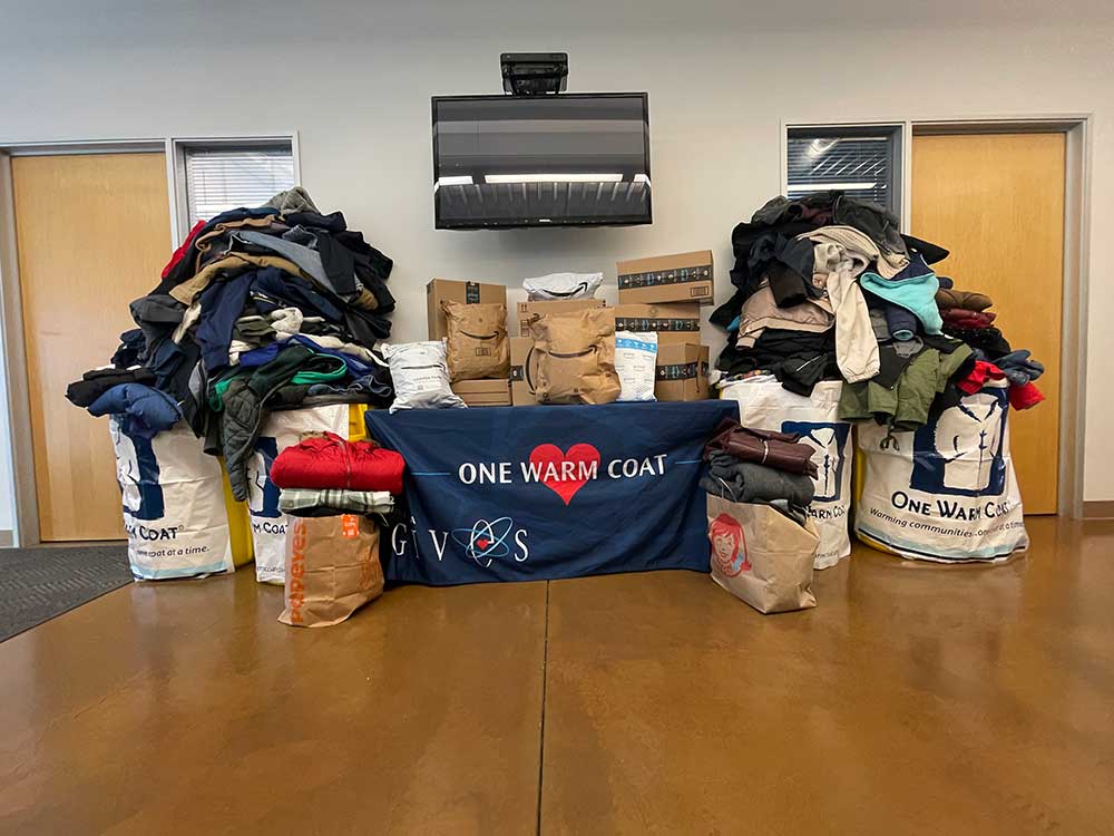 COATS FOR ALL — Coats are piled high and sorted on Dec. 6, for the 13th Annual One Warm Coat Drive, led by Sandia California as part of the Sandia Gives campaign. Staff donated 335 coats, exceeding their goals for the drive. One Warm Coat raises awareness of the need for coats and partners with nonprofits across the U.S. to distribute them. (Photo by Krissy Galbraith)