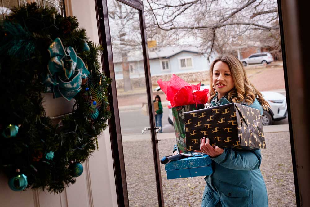 SPECIAL DELIVERY — Sunny Holmes, Saranam community engagement coordinator, helps Sandia manager Elizabeth Kivlighan unload a car full of gifts donated by Sandians to Saranam, an organization that serves unhoused Albuquerque families. Elizabeth led the donation effort at Sandia. (Photo by Craig Fritz)