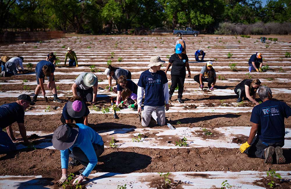 TOMATO PLANTERS — Sandia intern Matthew Bailey, center, joins a group of about 50 staff members, their families and friends to plant tomatoes. The May 10 event was hosted by Seed2Need, a nonprofit organization that recruits volunteers to plant fresh produce to donate to local food pantries. (Photo by Craig Fritz)