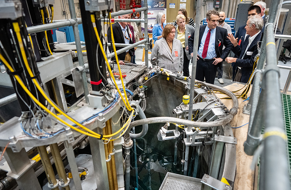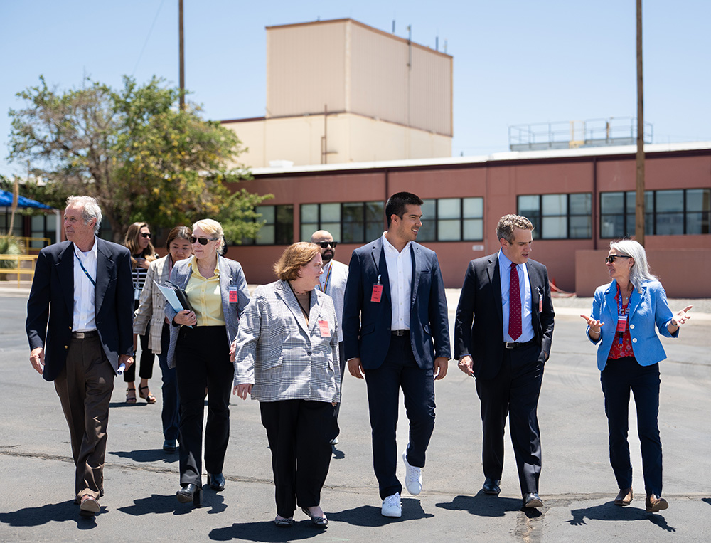 DEBRIEF — From left, Annular Core Research Reactor Director Bryan Oliver, Labs Director Laura McGill, DOE Senior Advisor Rebecca Michael, DOE Special Advisor Juan Pablo Varela, DOE Deputy Secretary James Danly and NNSA Acting Administrator Teresa Robbins talk as they leave the reactor facility, shown in the background. (Photo by Craig Fritz)REACTOR VISIT — Annular Core Research Reactor Director Bryan Oliver, right, briefs DOE Deputy Secretary James Danly, center, NNSA Acting Administrator Teresa Robbins, Senior Advisor to the Deputy Secretary Rebecca Michael, Labs Director Laura McGill and Sandia Associate Labs Director Doug Kothe during a tour of the reactor facility on July 10. (Photo by Craig Fritz)