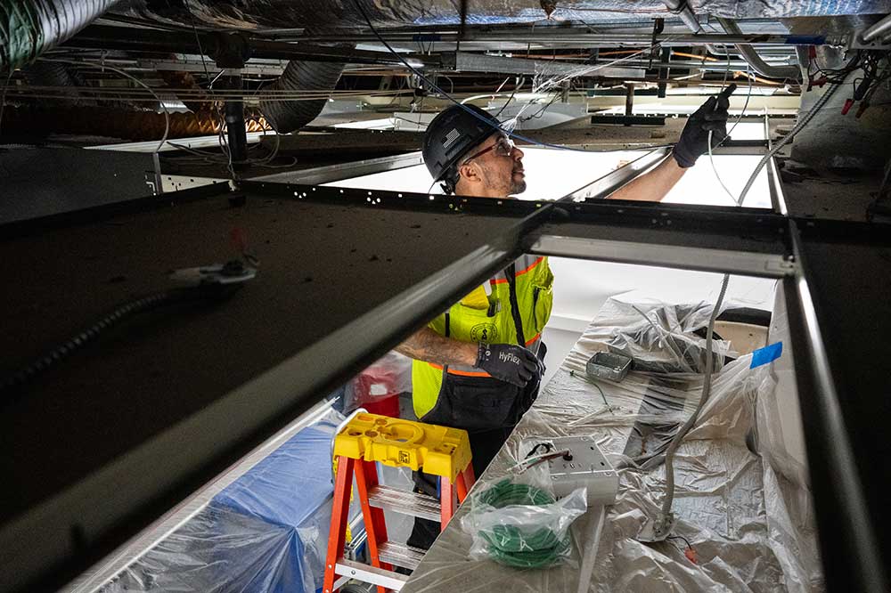 EXPANDING TO NEW MEXICO — Strategic Industry Inc. team member Eli Vasquez updates electrical connections at Sandia’s Saturn pulsed-power generator facility in Albuquerque. (Photo by Craig Fritz)