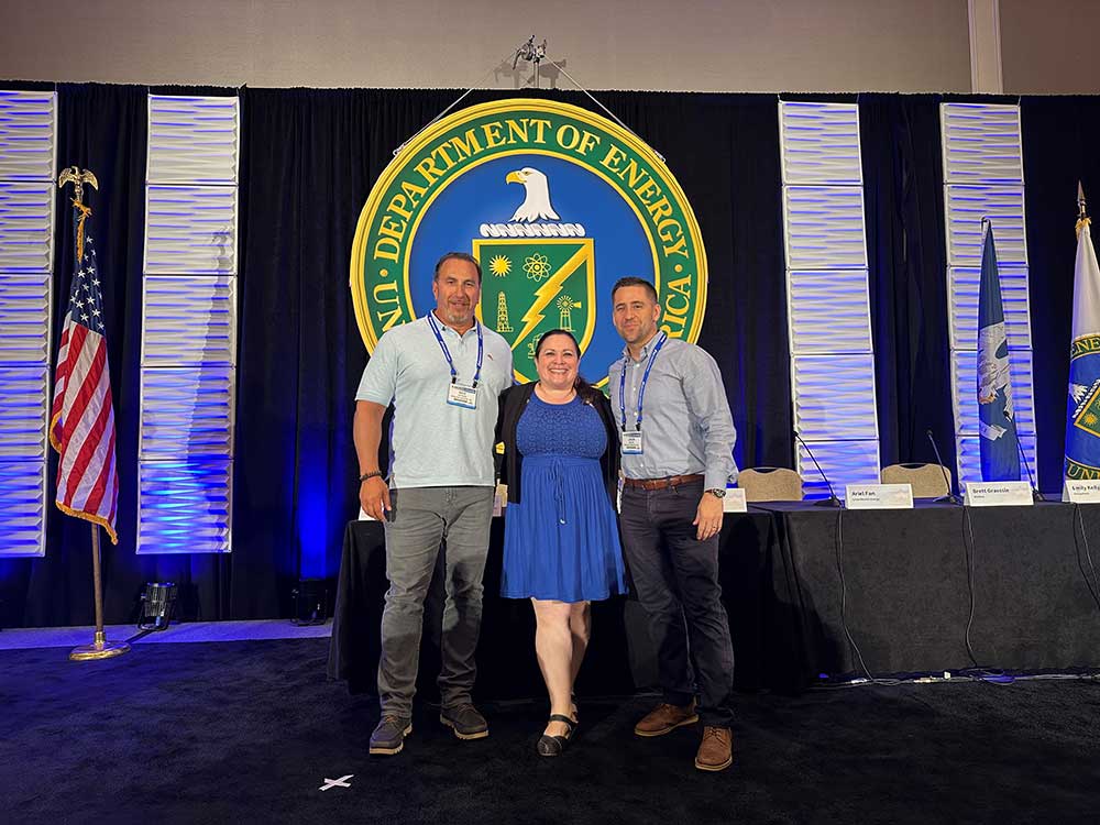 PROTÉGÉ OF THE YEAR — Rick Arteaga, left, and Jason Miller, right, both from Strategic Industry Inc., join Sandia Mentor-Protégé Program Lead, Royina Lopez at a DOE event honoring Mentor-Protégé Program award recipients. (Photo by Patricia Brown)