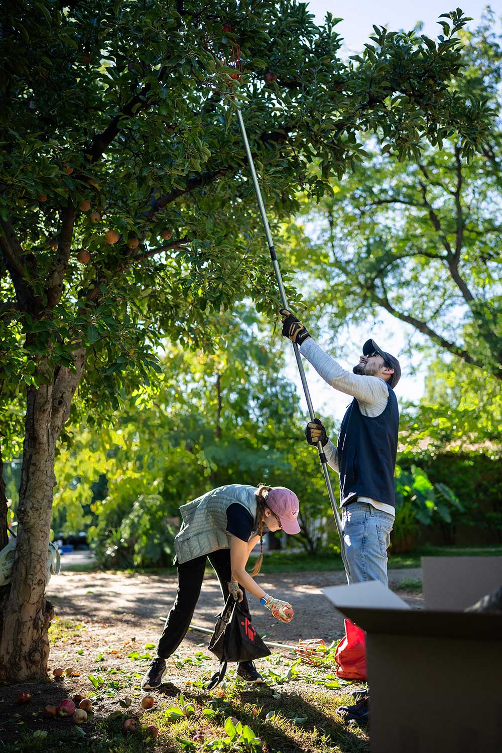 HIGH YIELD — Data scientist Emily Kemp and her partner Giovanni Brusca pick apples with Seed2Need in Corrales, New Mexico. More than 100 Sandians, family members and friends attended the volunteer event. (Photo by Craig Fritz)
