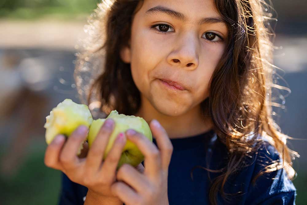LITTLE HELPER — Emilia Cano, 6, takes advantage of the opportunity while helping her mom, Carmela Andrade, pick apples with Seed2Need on Sept. 20. (Photo by Craig Fritz)