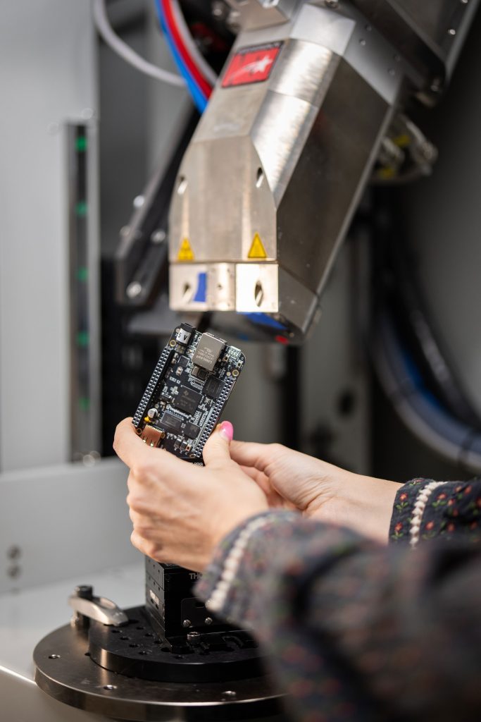 MULTI-METAL POWER —Noelle Collins sets up for an X-ray CT scan of a circuit board as part of the Non-Destructive Evaluation group at Sandia. (Photo by Craig Fritz)