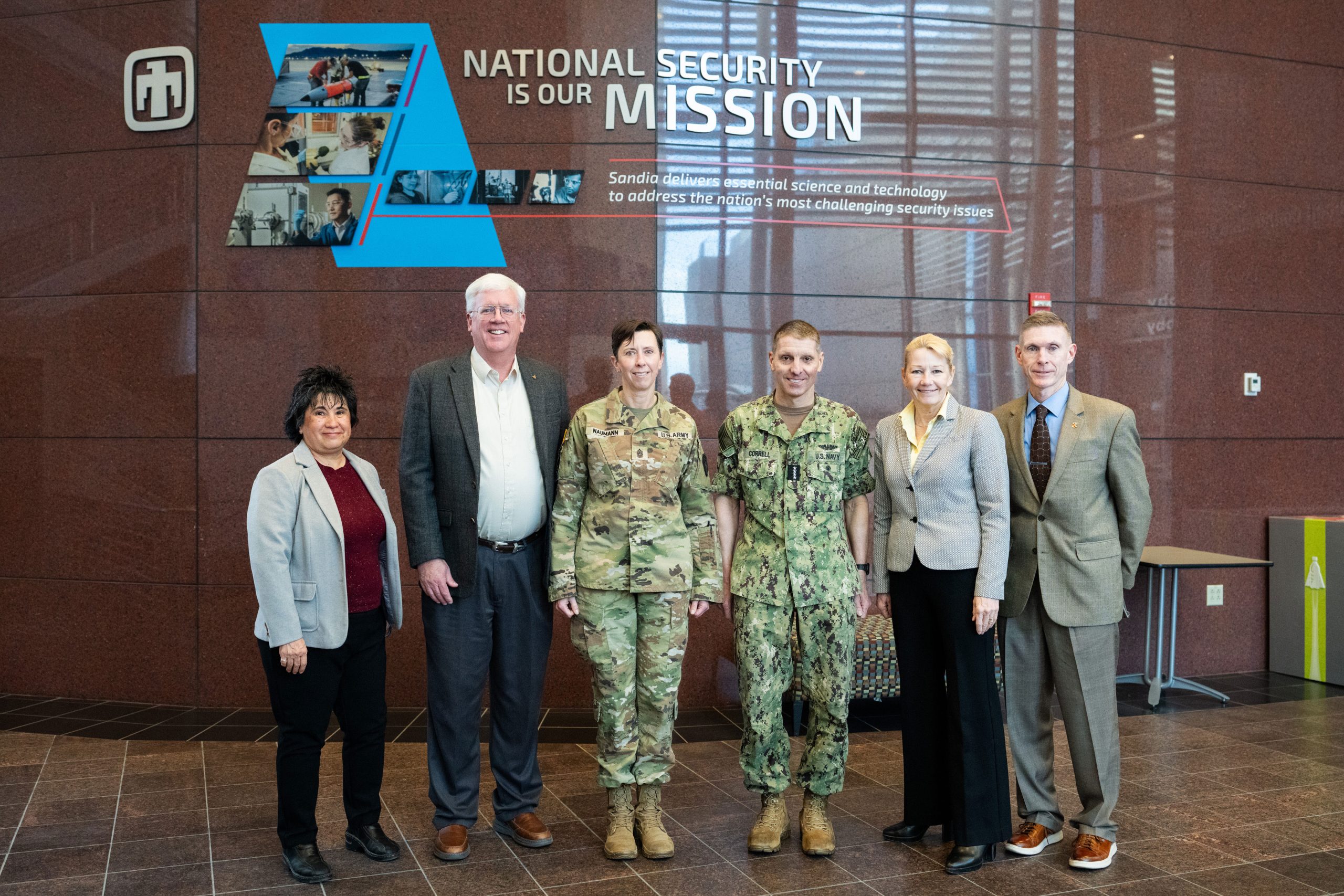 STRATCOM VISIT — From left, Sandia Deputy Labs Director Rita Gonzales; NNSA Sandia Field Office Manager Daryl Hauck; U.S. Army Command Sgt. Maj Jo Naumann, command senior enlisted leader of U.S. Strategic Command; USSTRATCOM Commander U.S. Navy Adm. Rich Correll; Labs Director Laura McGill; and USSTRATCOM Capability and Resource Integration Director Robert Taylor pose for a photo during a Feb. 11 visit and tour of the Labs. (Photo by Craig Fritz)STRATEGIC SUPPORTER — U.S. Navy Adm. Rich Correll, commander of U.S. Strategic Command, left, walks and talks with Labs Director Laura McGill during his tour of Sandia on Feb. 11. During his visit, Correll met with Sandia leaders to discuss nuclear deterrence futures, product realization progress and challenges, Microsystems Engineering, Science and Applications, work in AI and quantum, and more. He toured the Weapons Display Area and the Counterfeit Detection Center. (Photo by Craig Fritz)
