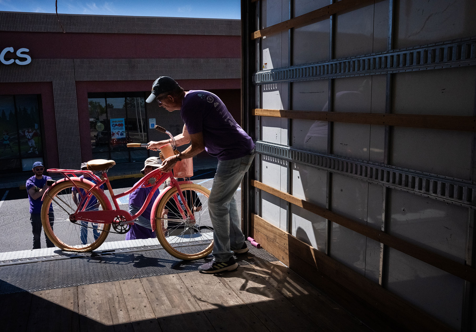 TUNE UP — Clay Campbell with Free Bikes 4 Kidz New Mexico loads a bike into a box truck at the Trek Store on April 4. The organization collected 48 bikes at the event. Sandia volunteers assisted with cleaning and refurbishing them for donation to local partners such as afterschool programs, health clinics, church groups, crisis centers and tribal organizations. (Photo by Craig Fritz)