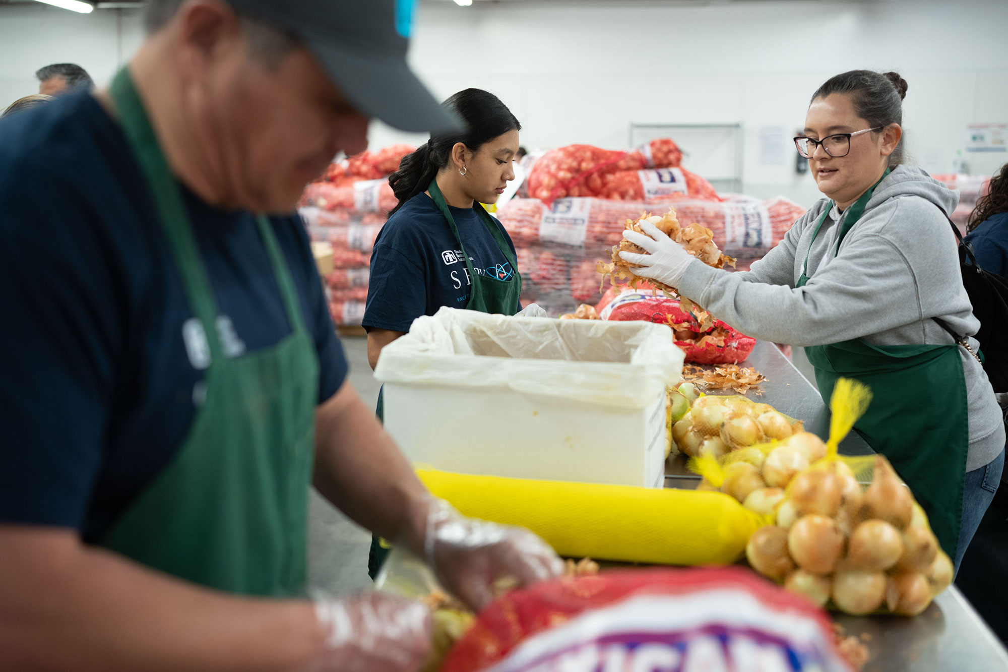 SMOOTH OPERATION — From left, engineering project lead Bob Pacheco, Mariah Ramirez and her mother, auditor Ashley Ramirez, sort and pack 50-pound bags of onions during a service project at Roadrunner Food Bank on April 25. (Photo by David Lienemann)