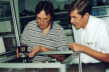 REMOTE SENSORING -- Sandia's Mike Sinclair (left) and Mike Butler prepare to put the dime-size Polychromator remote sensor chip into a testing unit.