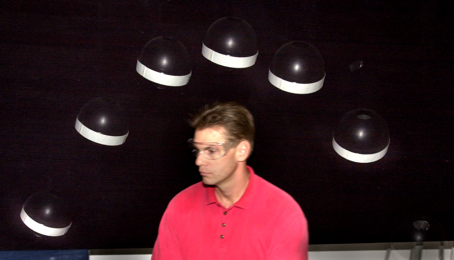 ONE GIANT LEAP Barry Spletzer of Sandia National Laboratories Intelligent Systems and Robotics Center shows how high the new hopping robots can go. This one leaps 10-20 feet high on each jump. The Sandia researchers have achieved hops as high as 30 feet with their unique combustion approach. (Photo by Randy Montoya)
