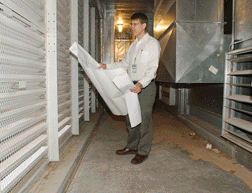 SANDIA RESEARCHER Richard Griffith studies blueprints of a building to better understand airflow. He has led a team that developed modeling and simulation tools for assessing the threat and vulnerability of buildings to biological and chemical assaults. This includes looking at how these agents move and are deposited inside a building. (Photo by Randy Montoya)