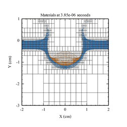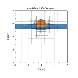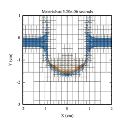 The software breaks down the penetration simulation into millions of grid-like cells. As the modeled projectile (such as a copper ball impacting a steel plate) impacts and penetrates the target, progressively smaller blocks of cells are placed around the projectile, each showing in detail the deformation and breakup of the ball and target plate.