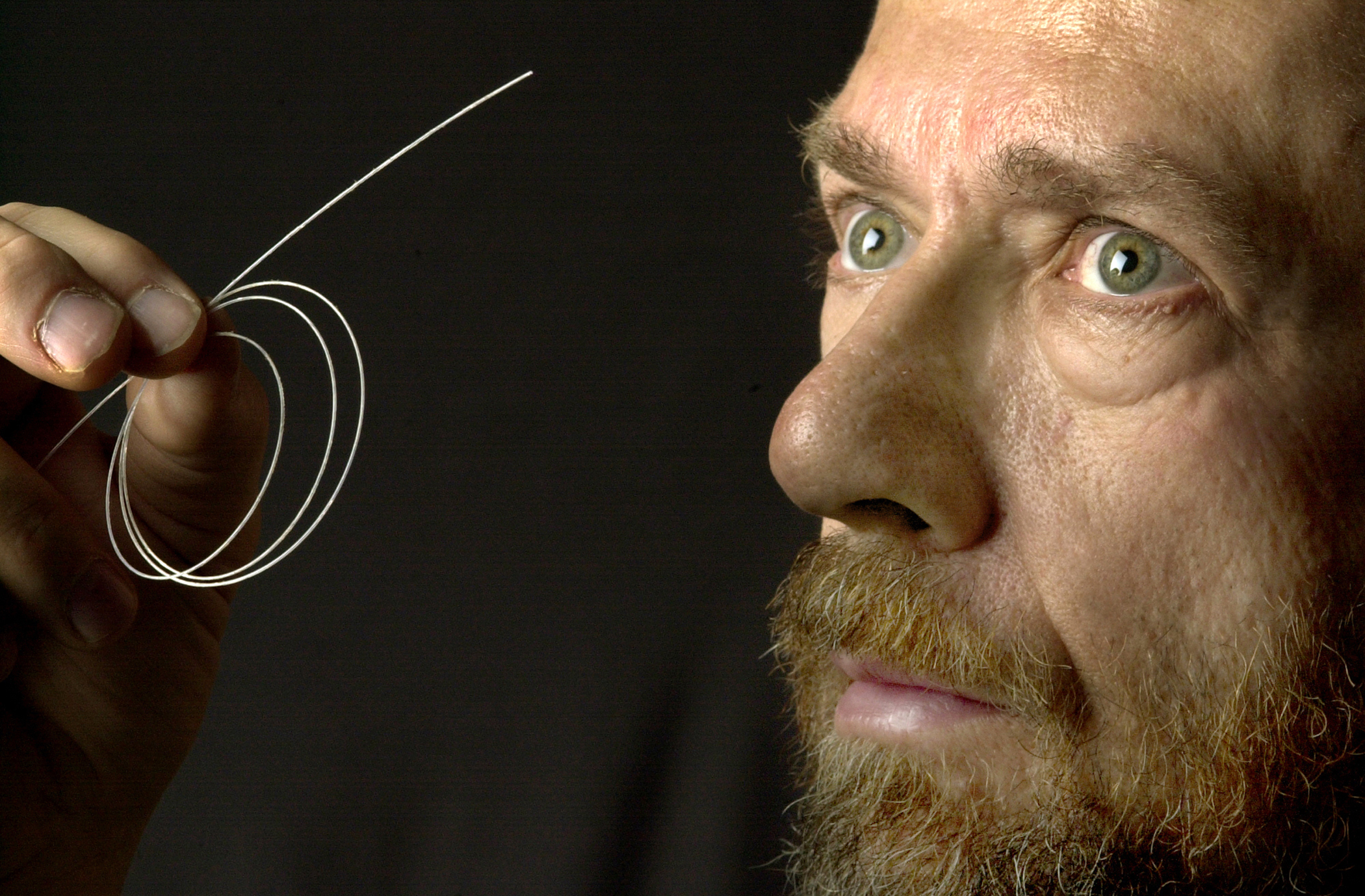 DISPOSABLE FIBER OPTICS Sandia researcher David Holcomb takes a close look at the disposable fiber optics he has developed to relay information about what is going on at the end of a drill string as it is happening, without stopping the drilling operation. The new technique is capturing the attention of the oil and gas industry.