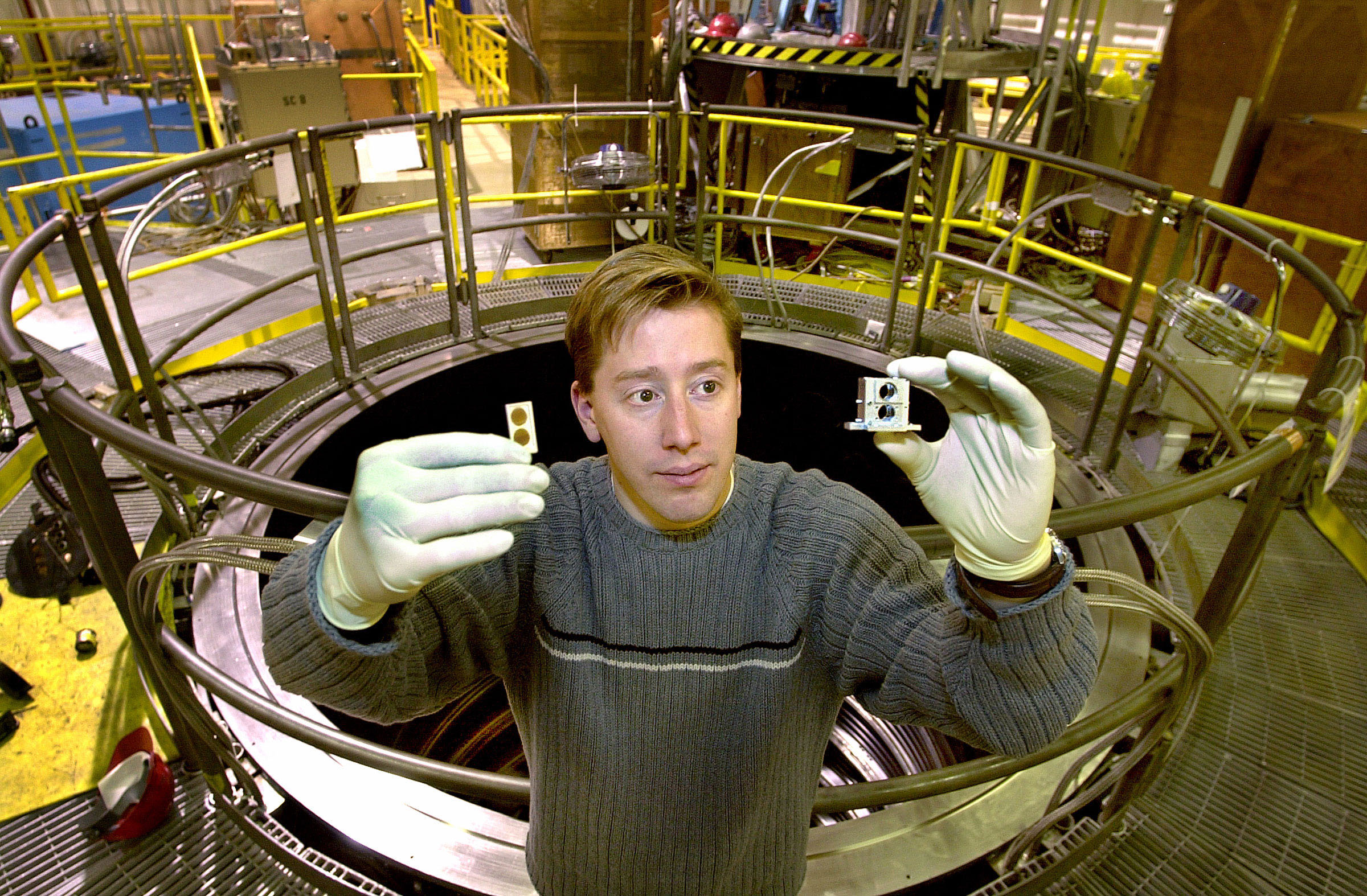 PENNIES FOR THE TOLLWAY? Sandia researcher Mark Knudson holds two flyer plates in his right hand and chambers of his high-tech gun in his left. In the background is the innermost sanctum of Sandias Z accelerator, where a rapidly expanding magnetic field drives pellets faster than any mechanism on earth. (Photo by Randy Montoya)