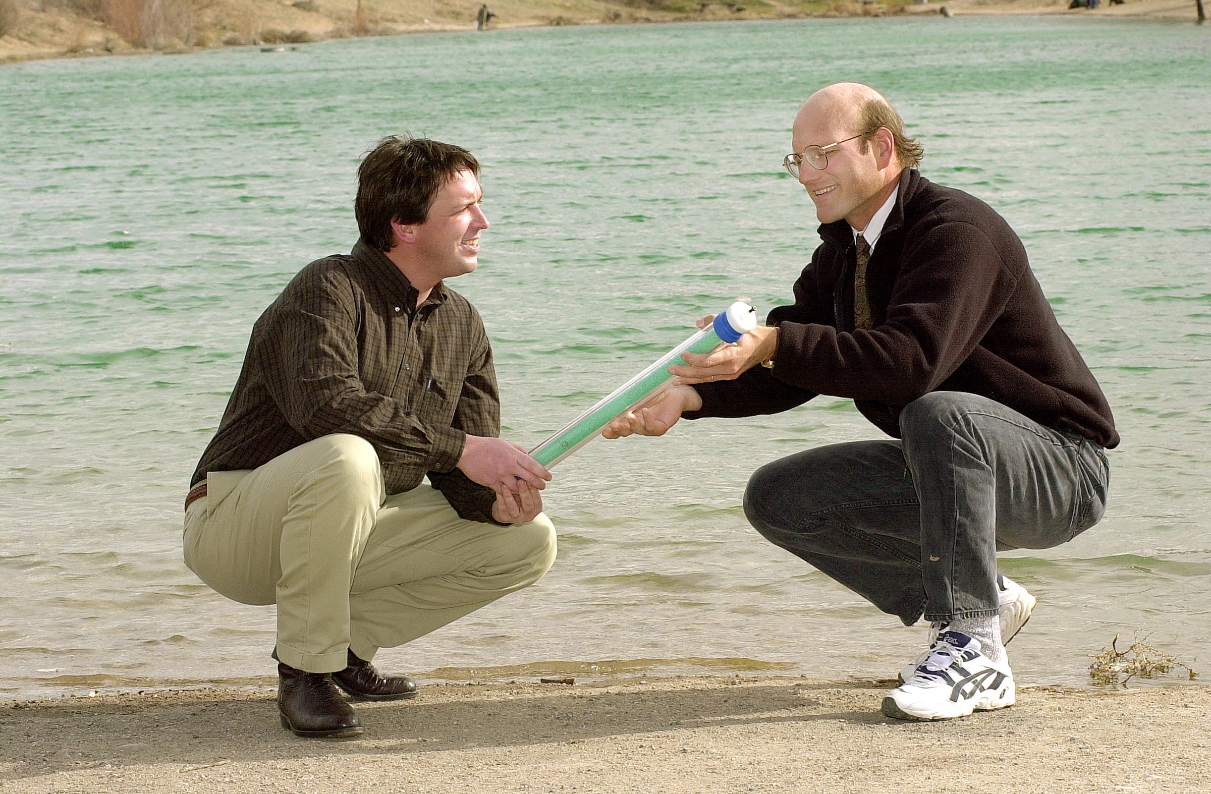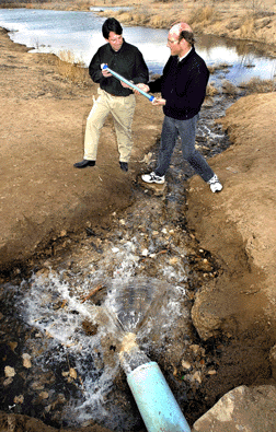 WATER SANS ARSENIC David Teter (left) and Pat Brady are members of a Sandia National Laboratories research team that developed new arsenic-getting materials they call Specific Anion Nanoengineered Sorbents (SANS). Groundwater flowing through a column of the SANS would have its arsenic content reduced to undetectable levels. (Photo by Randy Montoya)