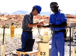 FIELD TEST Sandia researches Cliff Ho and Henry Bryant deploy a chemiresistor package at Sandias Chemical Waste Landfill as part of a field test.