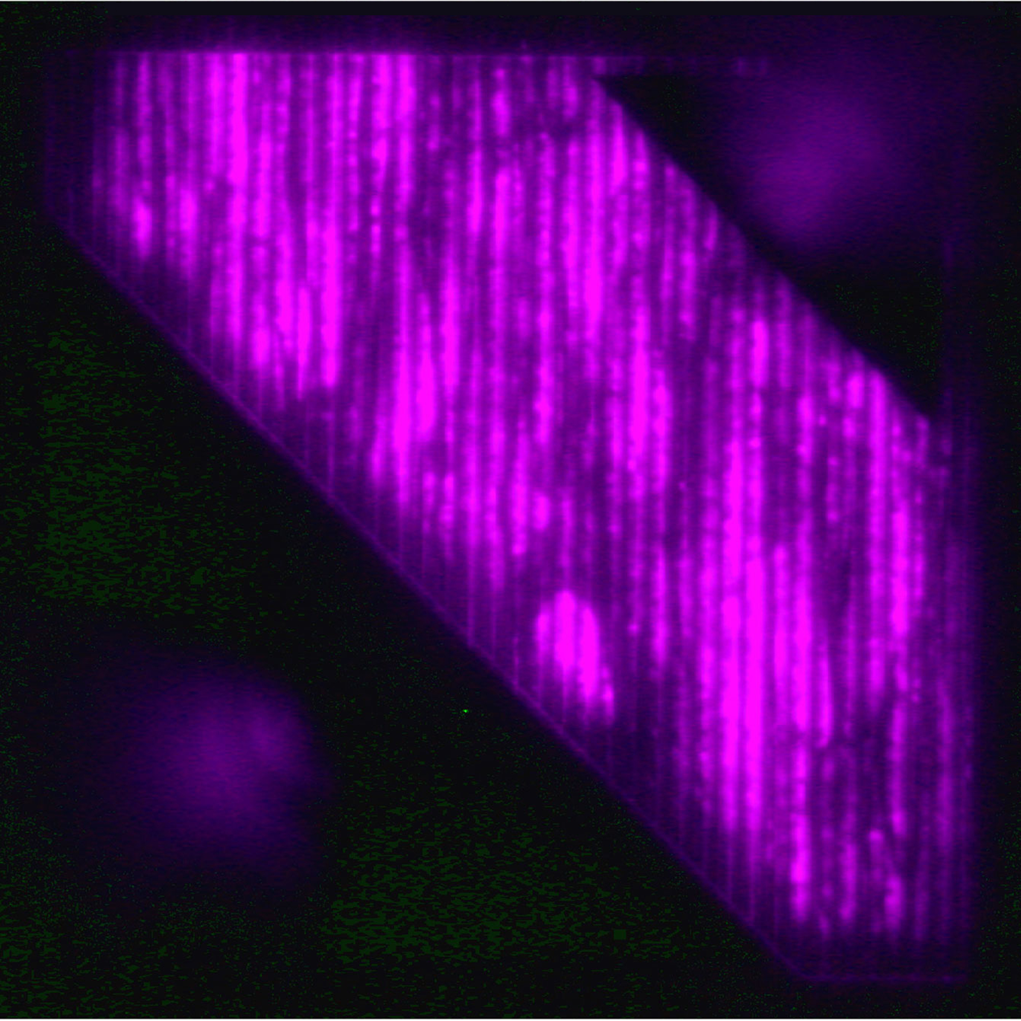 NEW LED This image shows a close-up of the emitted light from an ultra-violet cantilever LED taken with a camera sensitive to UV. The material was both grown and processed into an LED at Sandia.