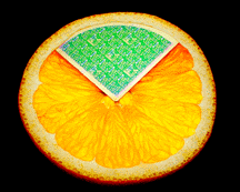 ORANGE YOU TINY? -- Some 30 individual chips with acoustic wave sensors make up this quarter of a wafer, which fits nicely on an orange slice.