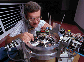 ![[imbalance]](images/imbalanc.gif) WEIRD SCIENCE? No, simpler science. Sandia's Mark Vaughn checks connectors on a prototype control system that moves weights around a circular rim to reorient a rocket flight or satellite orbit without use of jets or jet fuel. (Photo by Randy Montoya)