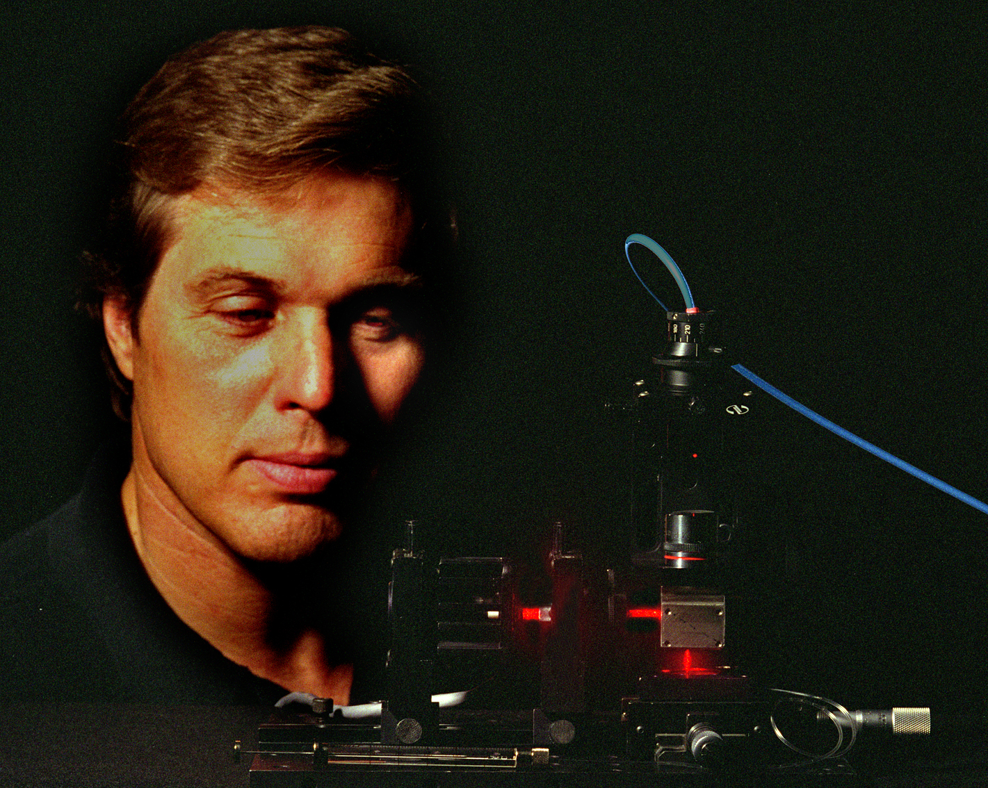 ![[photo of Gourley]](images/gourley.gif) BLOOD LASER - Paul Gourley examines a semiconductor diode laser's horizontal and then bent vertical beam used to excite his VCSEL biocavity laser. The VCSEL releases an invisible infrared beam carrying information about blood cells to a detector, above. (Photo by Randy Montoya)