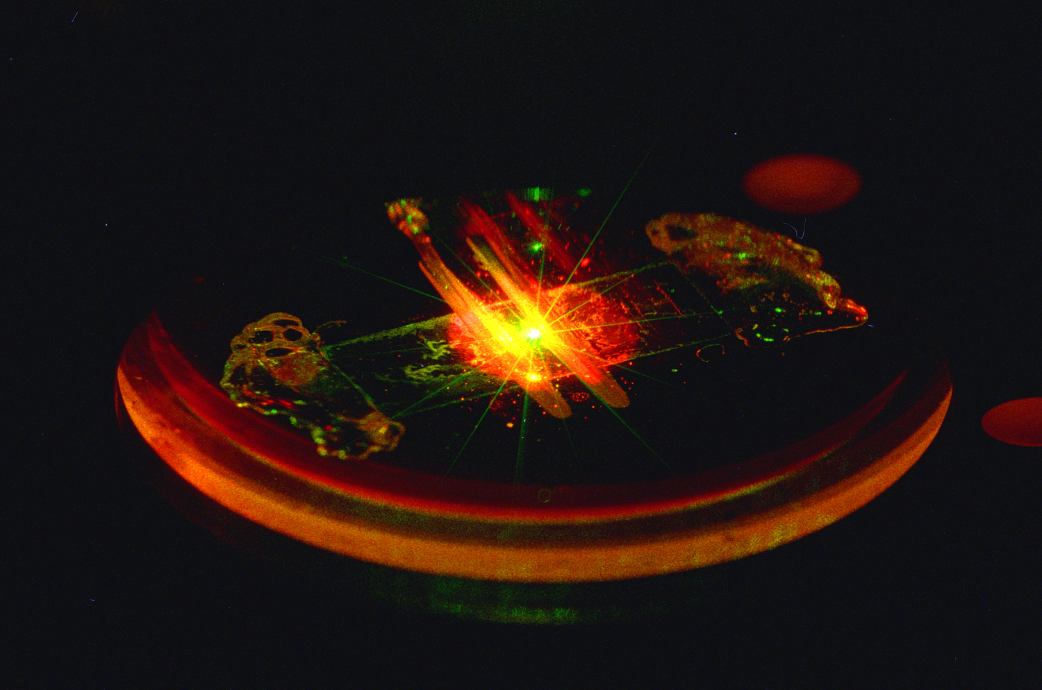 | ![[VCSEL]](images/vcsel_red.gif) LAB ON A CHIP COMES CLOSER - A biocavity laser - a VCSEL capped by a glass plate enclosing a blood sample, all about the size of a quarter - is excited by a pump laser in Paul Gourley's lab. The VCSEL device can produce information about the state of millions of blood cells in a few minutes.
