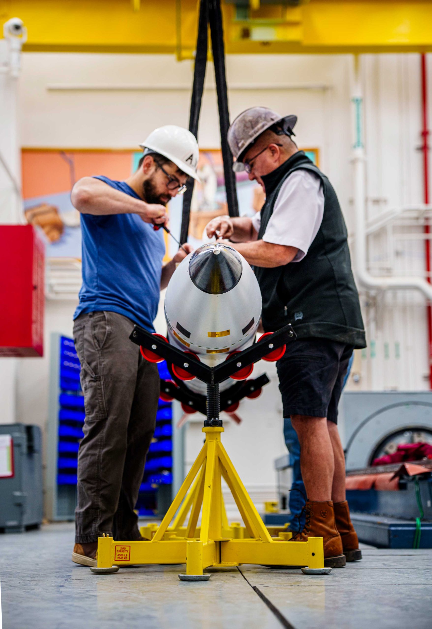 An engineer and technologist prepare an inert B61-13 vibration fly-around unit for testing.