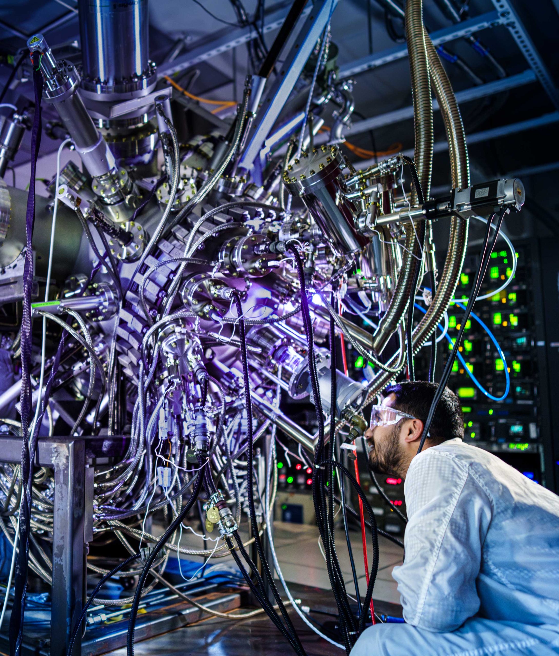 A materials scientist at Sandia gazes into a viewport of a molecular beam epitaxy reactor, highly specialized equipment Sandia will use to build experimental photonic cooling plates designed at startup Maxwell Labs for testing.