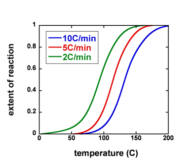 Measured with a TA Instruments Q2000 DSC using ramped profiles. High Tg with corresponding fast reaction rate does not allow isothermal cures. DOWNLOAD DATA 10C/min5C/min2C/minTemp (C)Temp (C)Temp (C)ExtentExtentExtent Reaction fit by:
